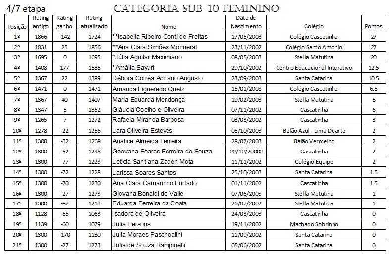 Resultado da categoria sub 10 feminino na 4ª etapa.